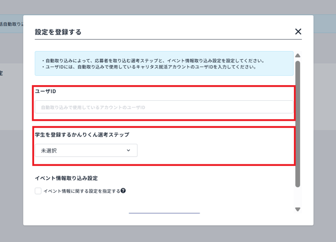 キャリタス就活上で予約されたイベント情報を、かんりくん上のどのイベントに紐づけるかを設定します。