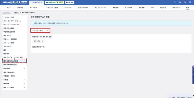 キャリタス就活から取り込みを行うにあたって、自動取り込みが開始される前までに、[ 設定 ]>[ 媒体自動取り込み設定 ]で、応募者ファイル取り込み設定を行いましょう。