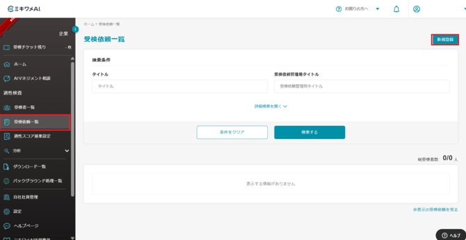- 受検依頼一覧>新規登録 から受検依頼を作成