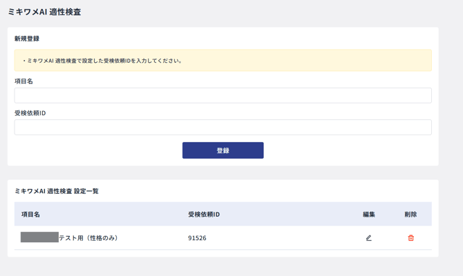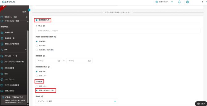 管理画面の「適性検査」メニューから「ミキワメAI 適性検査設定」を選択します。
