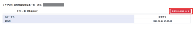 候補者が「受検待ち(案内済み)」状態の場合、結果セクション(候補者個人ページ>「ミキワメAI 適性検査受検結果」をクリック)にある「受検用URLを無効化する」をクリックすることで、受検案内を無効化することができます。