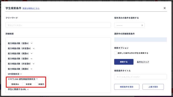 「ミキワメAI 適性検査受検状況」の項目で、以下のいずれかを選択して検索します。