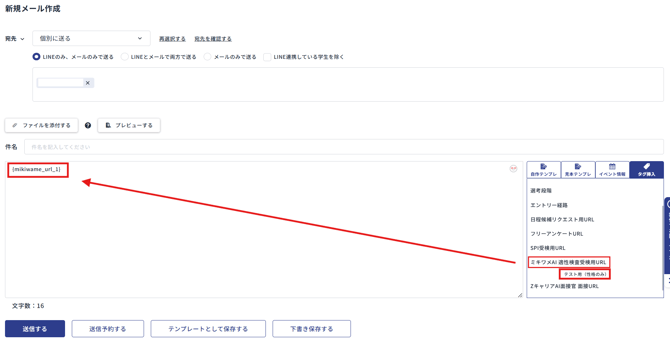 本文作成時に[タグ挿入]>[ミキワメAI 適性検査受検用URL]>対象テストを選択