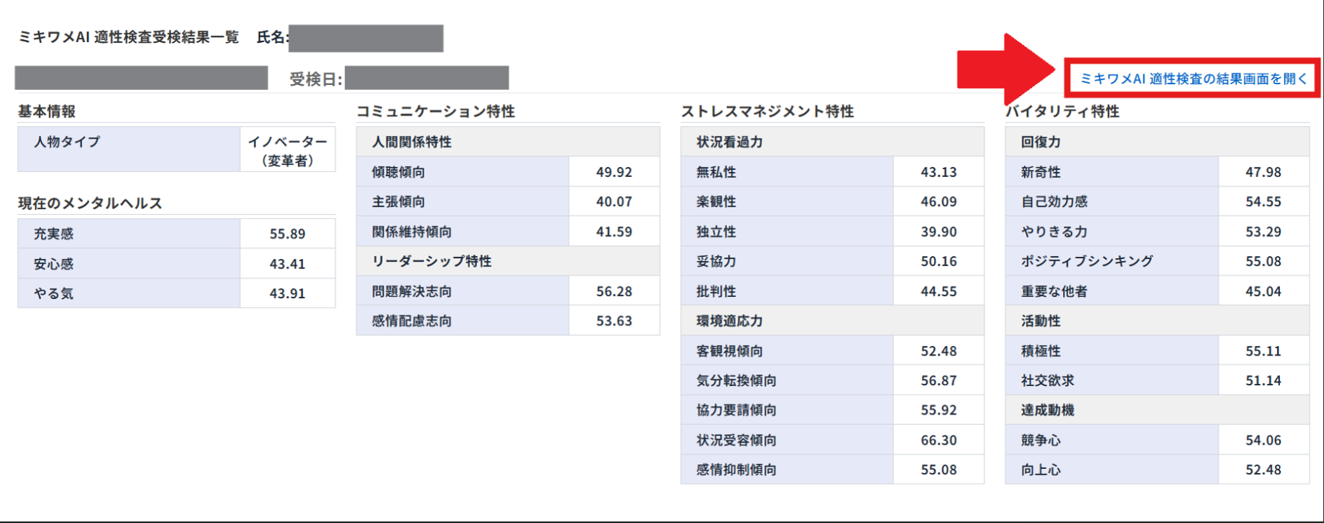 「ミキワメAI 適性検査結果」セクションを確認します。