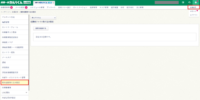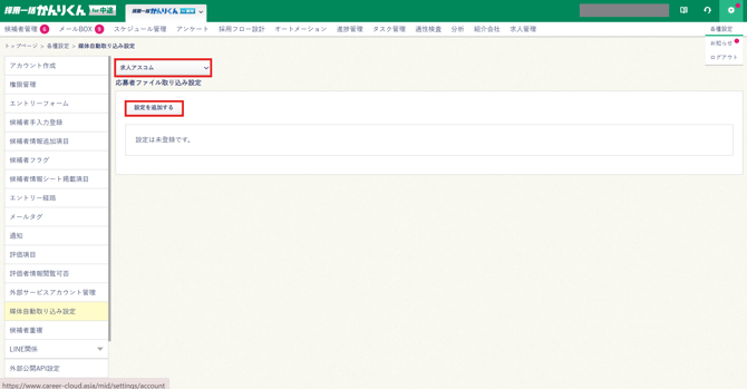 [歯車マーク]>[各種設定]>[外部サービスアカウント管理]に求人アスコムのログイン情報をご記入ください。