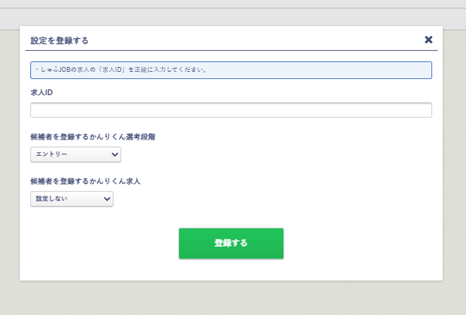 しゅふJOBからかんりくんに取り込む求人と、かんりくんの採用フロー/選考段階/求人を紐付けます。