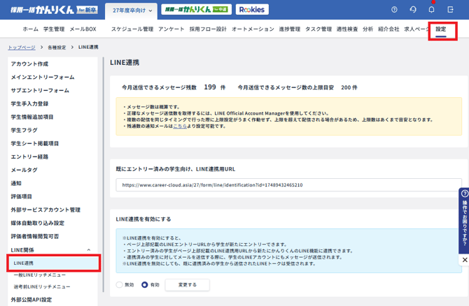 ・LINE連携を有効にすると、すでにエントリーいただいている学生・候補者や候補者の方でも「既にエントリー済みの学生・候補者向け、LINE連携用URL」を利用して、LINE連携できるようになります。