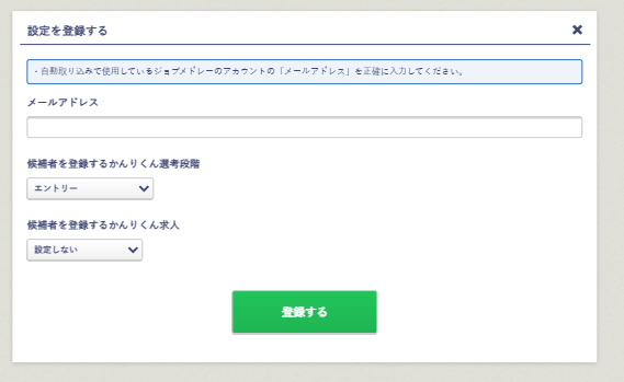 取り込みたいジョブメドレーのアカウント(メールアドレス)と、かんりくんの採用フロー/選考段階/求人を紐付けます。