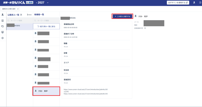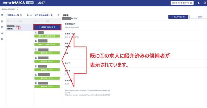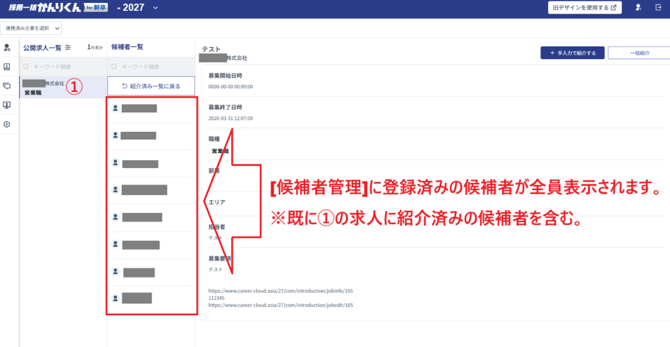 本ページでは、[求人を探す]の画面にて、かんりくんをご利用の紹介先企業様に対して、学生や候補者を紹介する方法についてご説明します。