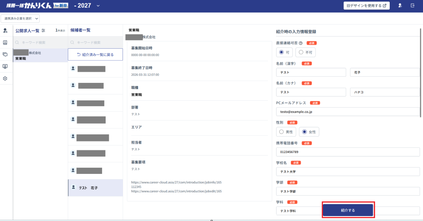 求人検索画面から紹介先企業へ学生・候補者を個別または一括で紹介する手順を解説します。