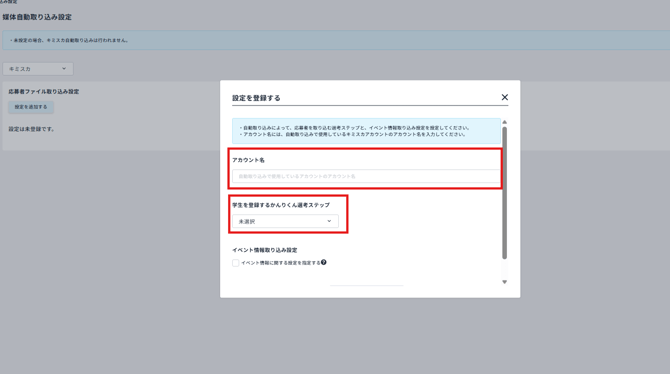 キミスカから取り込まれた学生がどの採用フロー・選考段階に紐づけるのかを設定します。