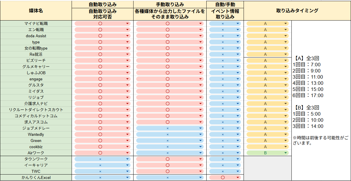 媒体ごとの取り込み可能項目は 【中途】 かんりくんへの取り込み可能項目一覧表をご確認ください。