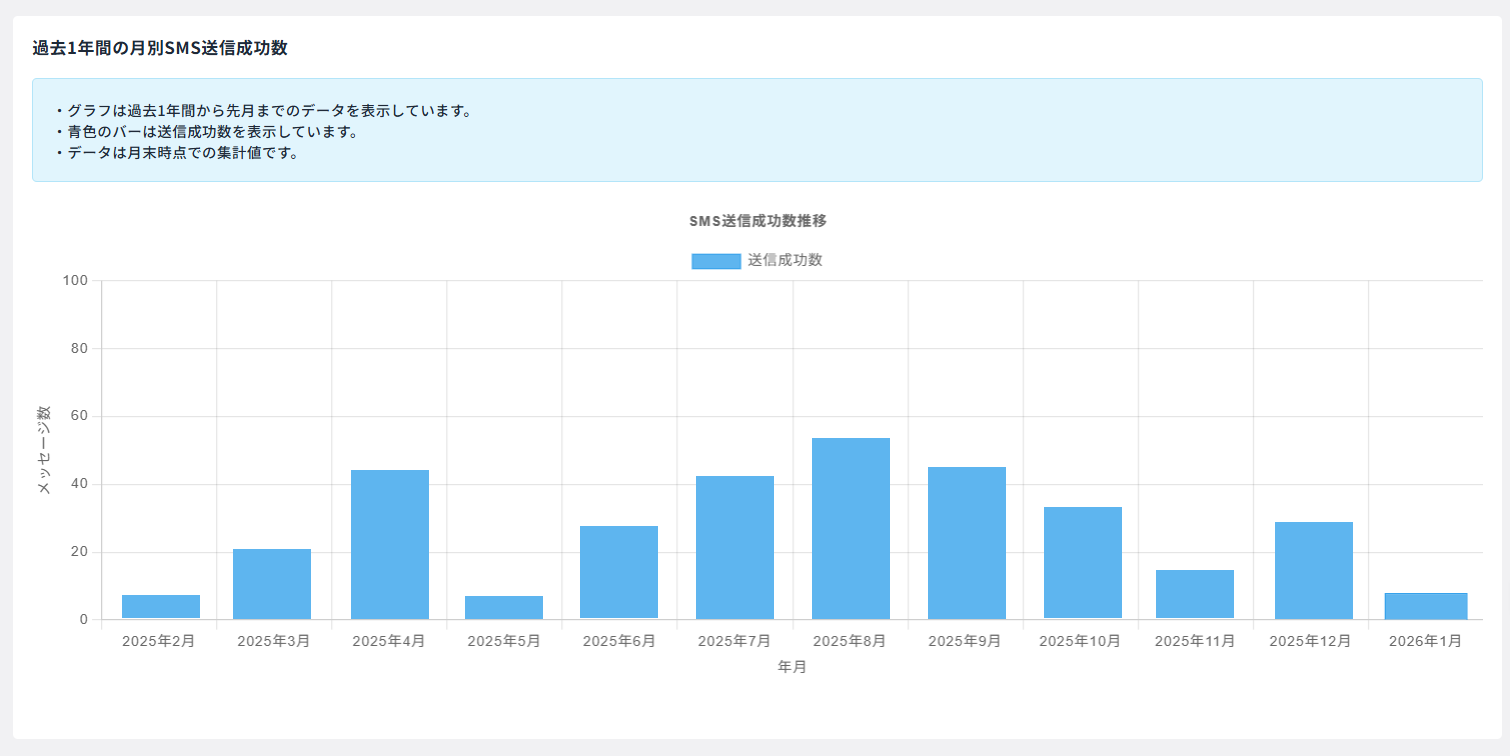 - 過去1年間の月別SMS送信成功数(成功件数のグラフ表示)