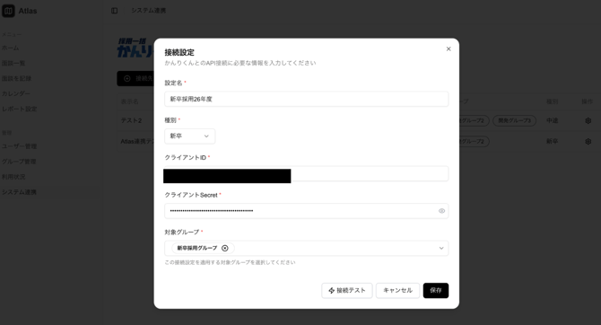 - 採用一括かんりくんで発行したクライアントID、クライアントシークレットを入力し接続テストを行う