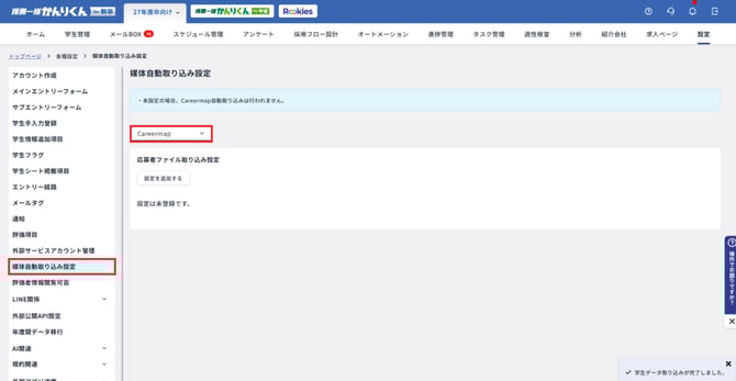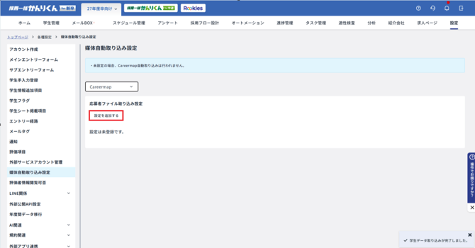 Careermapから取り込みを行うにあたって、自動取り込みが開始される前までに、[ 設定 ]>[ 媒体自動取り込み設定 ]で、応募者ファイル取り込み設定を行いましょう。